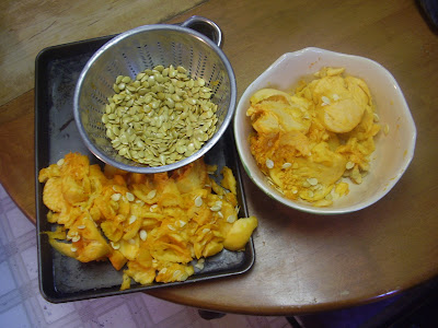 Hubby made me a cup of tea and I set down to finish sorting the pumpkin seeds. These are from my Jarrahdale pumpkins. Hubby baked the two largest yesterday and saved the innards for me. He put the baked flesh into freezer bags and into the freezer, for future pies, breads and muffins.